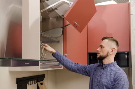 attractive bearded man pulls out a plate from a drying cupboard in a modern kitchen.