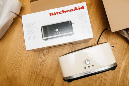 Paris, France - Feb 1, 2021: View from above of new KitchenAid 5KMT4116EAC toaster luxury product with 2 compartments long slices on the parquet wooden floor