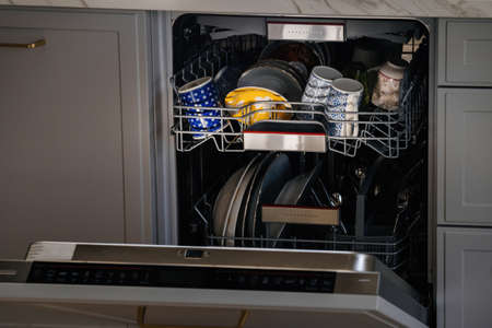 Close-up of dischwasher with multiple cups and shishes inside in modern luxury kitchen
