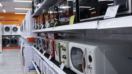 March 23, 2021 Balti Moldova supermarket or wholesale hypermarket. Department of goods for the kitchen. Illustrative editorial. Showcase with microwave ovens.