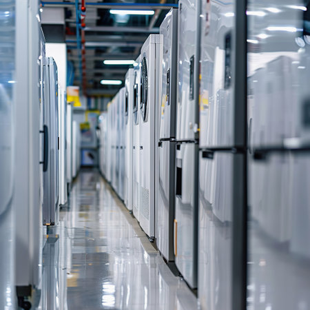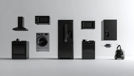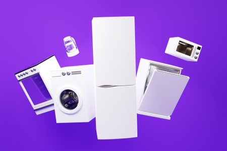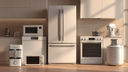 A contemporary appliances set featuring a dishwasher, washing machine, refrigerator, stove, and kettle, illuminated by soft, bright lighting that highlights their sleek and fresh design, perfect for modern home interiors, 3D illustration
