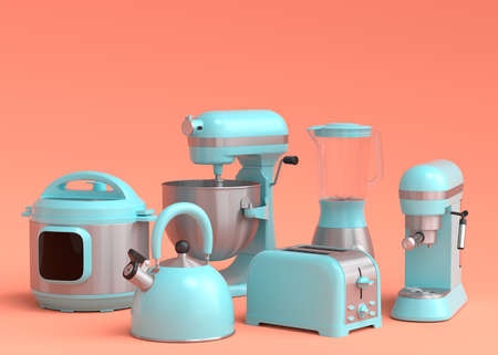 Electric kitchen appliances and utensils for making breakfast on coral background. 3d render of kitchenware for cooking, baking, blending and whipping