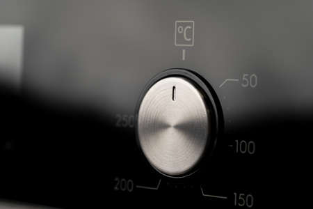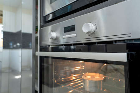 Close up of built in appliance. Element of electric oven with timer and buttons on control panel in modern kitchen room