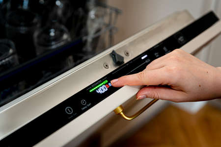 Woman choosing eco mode program on digital control panel of the dishwasher