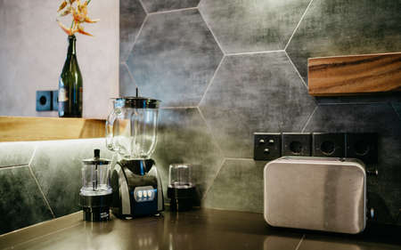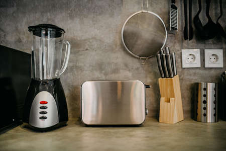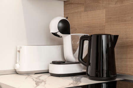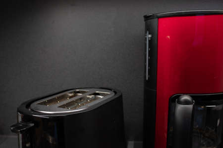 Appliances and devices in the kitchen for cooking. Toaster and coffee maker with copy space.