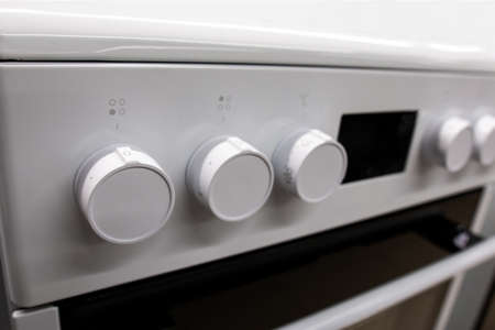Close-up shot of a white electric cooker's front panel with multiple oven functions