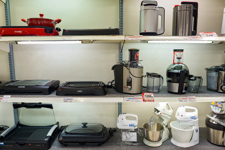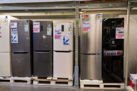 March 23, 2021 Balti Moldova supermarket or wholesale hypermarket. Department of goods for the kitchen. Illustrative editorial. Showcase with refrigerators