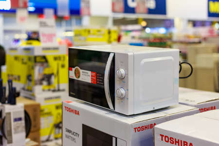 Maykop, Republic of Adygea, Russia - July, 21, 2021: department of household appliances with microwave ovens of different brands, selection of electrical goods for the kitchen and landry
