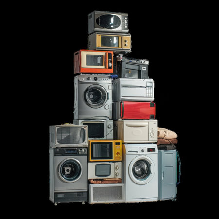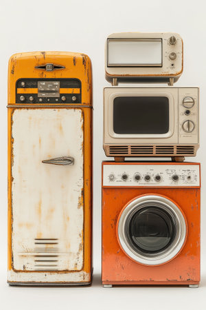 A collection of vintage kitchen appliances features an old-fashioned refrigerator, microwave, and washing machine. The bright orange and worn textures highlight the nostalgic charm of retro home technology.