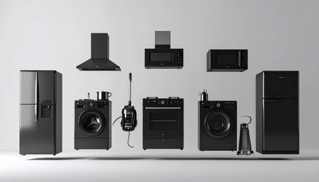 Collection of new household kitchen appliances illustrating a contemporary smart home featuring a refrigerator, oven, dishwasher, microwave, and small electronics like a blender, toaster, and kettle
