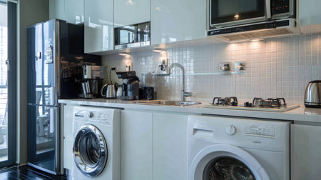 This image captures a modern kitchen featuring high-end appliances, including a washer and dryer, in an urban apartment setting. The stylish decor and efficient design create a bright, inviting space perfect for cooking and entertaining.