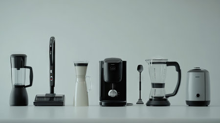 Set of household appliances, including a vacuum cleaner, blender, coffee machine, and kettle, all positioned neatly on a plain backdrop