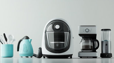 Clean, modern vacuum cleaner with kitchen appliances like a mixer, blender, and coffee machine, all isolated on a light background