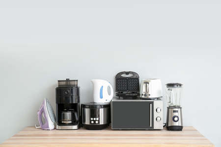 Kitchen electrical appliances and equipment, new small household appliances. Meat grinder, planetary mixer and blender on the table.