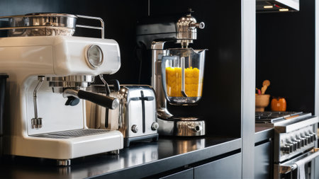 A kitchen counter with a coffee maker, blender and orange juice dispenser, AI