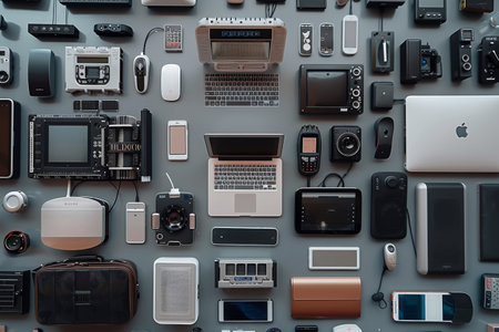 Various electronic devices are arranged on a gray surface, including computers, cameras, and audio equipment, illustrating the diversity and evolution of technology.