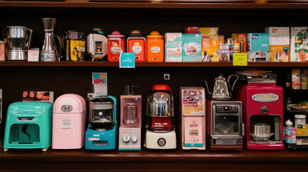 A vibrant collection of colorful kitchen appliances arranged neatly on a wooden shelf, showcasing retro and modern designs ideal for decorating home interiors.