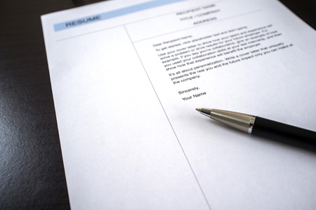 Close-up of resume and pen on black wooden desk. Business or job seeker concept.