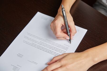 Woman writing on a white sheet of paper, signing a contract