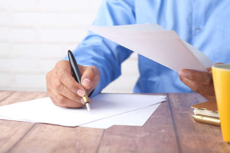Asian young business man of student holding a pen writing letter on paper at home