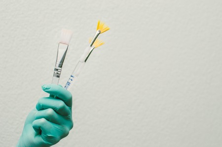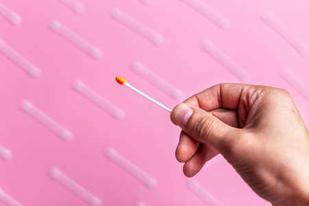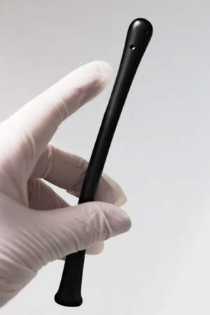 Close up of doctor's hand handling a smear test or swab test in front of a black background