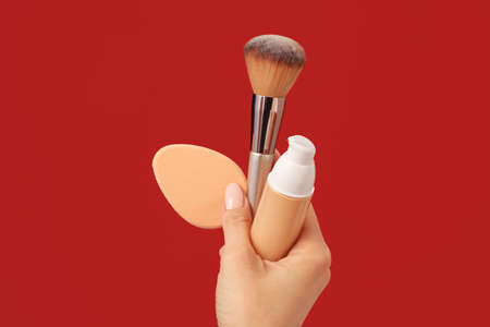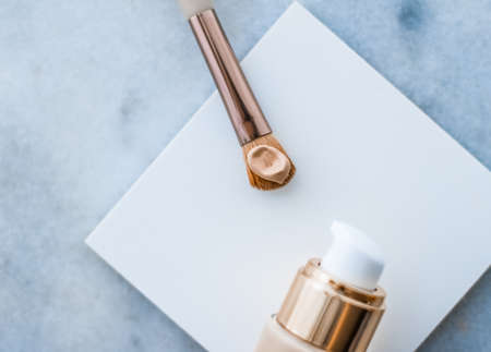 Cosmetic branding, glamour and skincare concept - Makeup foundation bottle and contouring brush on marble, make-up concealer bb cream as cosmetics product for luxury beauty brand holiday design