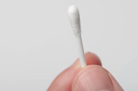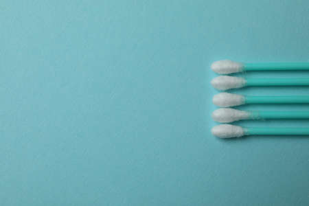 Sterile probe with a cotton swab for taking a nasal swab on a blue background, close-up. Concept of infections on the nasal mucosa.