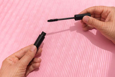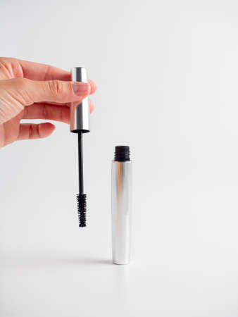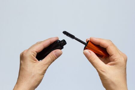 Women's hands hold the mascara open on a white background. A brush for applying mascara. The concept of cosmetics