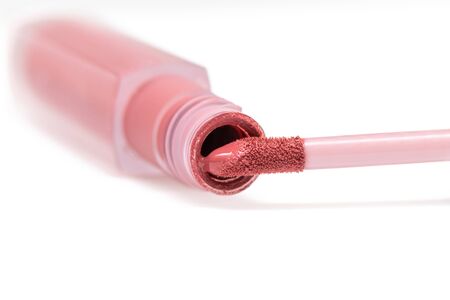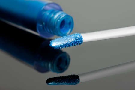 Brush for make-up lips and the bottle of liquid lipstick close-up on a blue background with copyspace. Shallow depth of field
