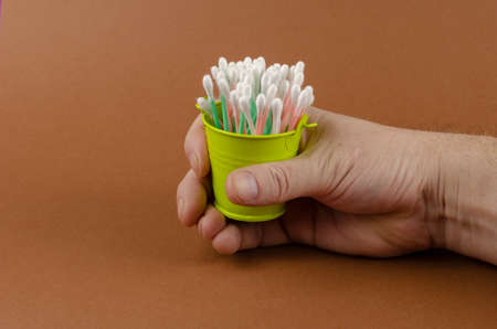 Small bucket, cotton swabs and a hand on a brown background. A man's hand is holding a full green bucket of new sanitary sticks.