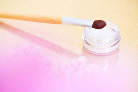 Silver sparkly eyeshadow and make up brush on white background. Selective focus.