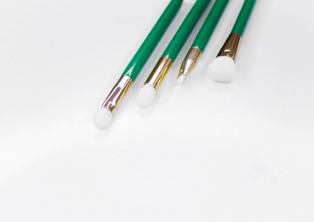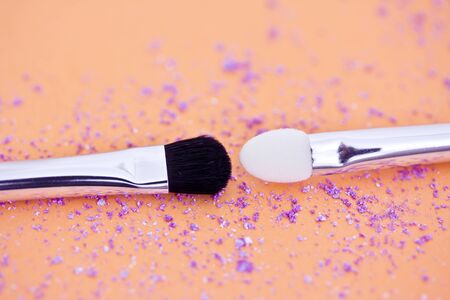Set of applicators for shadows on blue background. Shadows and eye makeup. Application of eyebrows. Banner.
