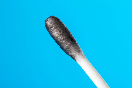 A woman's hand holds a cotton swab with earwax on a blue background, hygiene of the ears.
