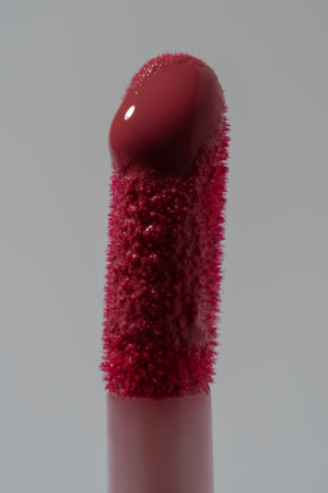 A clean lip gloss applicator tip is coated in a thick layer of rich, red gloss. The glossy, wet-look texture and vibrant color highlight the product's high-shine, reflective finish.