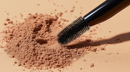 This close-up image features a sleek makeup brush resting on a pile of loose powder, showcasing the artistry of beauty applications. Perfect for cosmetics projects.