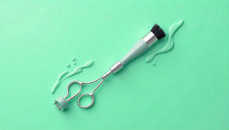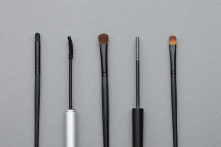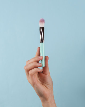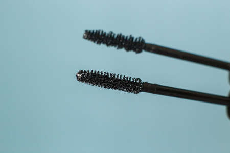 Woman holding mascara makeup brushes on the soft blue copyspace background