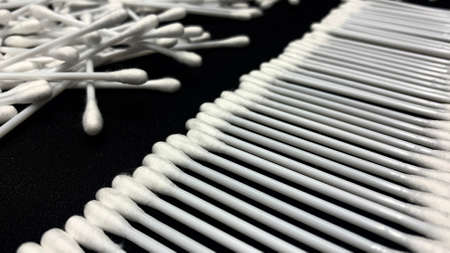 Scattered white cotton buds spilled out of the package and lie on a black table