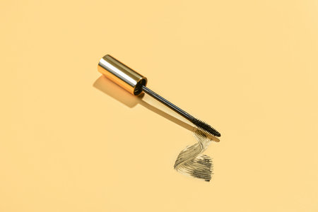 This artistic close-up showcases a mascara tube with intricate bristles, highlighting its dramatic shadow on a pastel background, perfect for beauty themes.