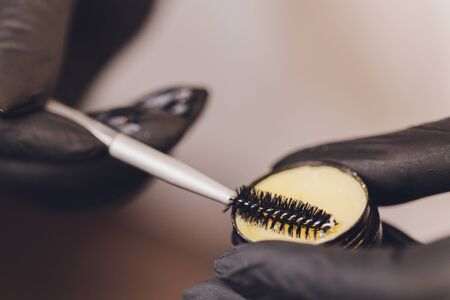 beautician- makeup artist applies paint henna on previously plucked, design, trimmed eyebrows in a beauty salon in the session correction. Professional care for face