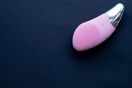 Silicone brush for washing face in foam. Blue facial cleansing brush on black background. Beauty and skincare concept. Brush for face lifting, anti-aging wrinkles and massage. Picture with copy space