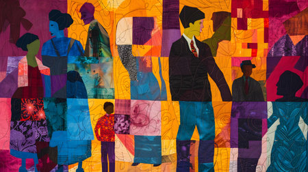 This vibrant and abstract artwork presents a dynamic composition of colorful geometric shapes and patterns creating a visually striking cityscape Silhouetted figures in various poses and gestures are