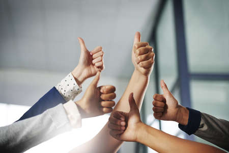 Youre doing a great job on making success happen. Cropped shot of a group of unrecognisable businesspeople showing thumbs up.