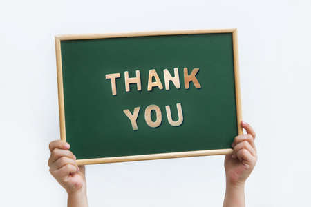Kid showing thank you signboard on white background