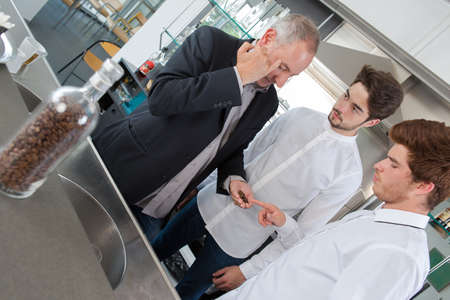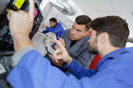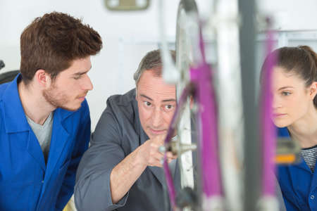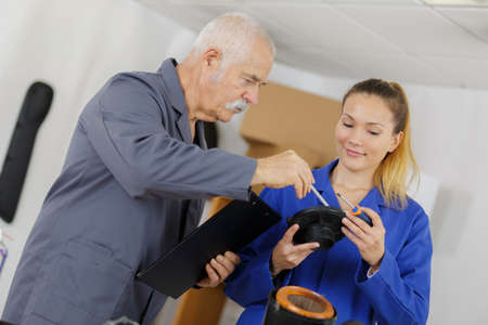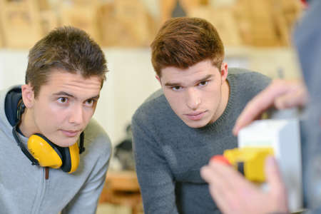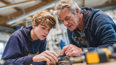 Male apprentice is learning woodworking techniques from older man in a busy workshop