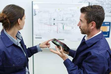 Two workers are considering the process of assembling furniture in the furniture shop. Toned image. Draw an analysis of the drawing on the table