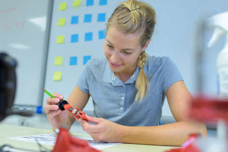College student presenting his builded robotic toy to young science teacher and his schoolmates at robotics classroom at school.