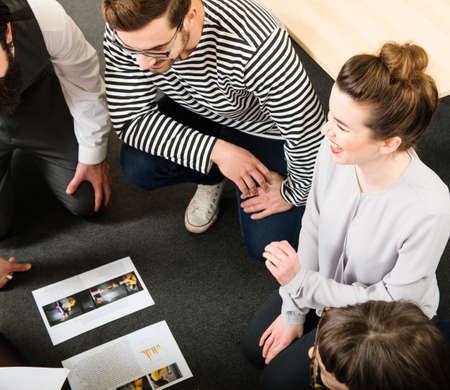 Educated advertisers, two guys and girl develop and place ads, conduct marketing research. Portrait
