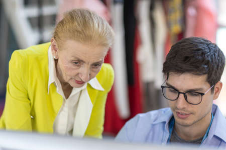 Senior female designer is talking to a male designer in a tailor shop. Concept. Retired designers working at home, creating income for the elderly