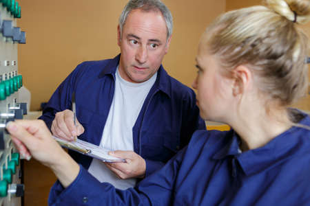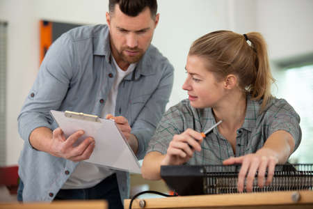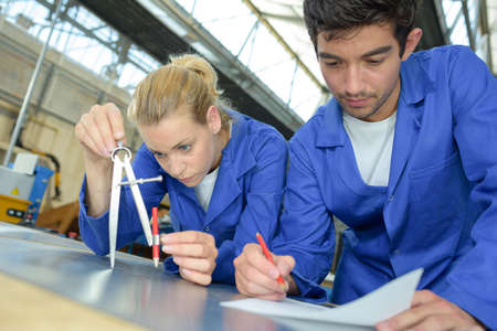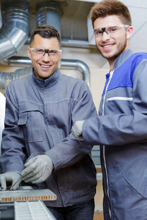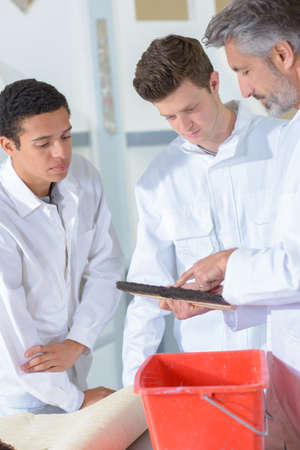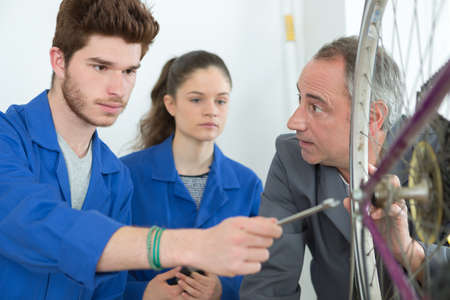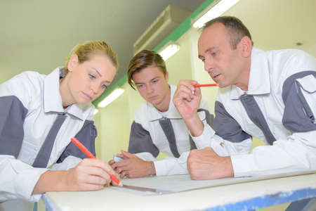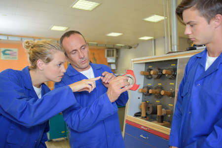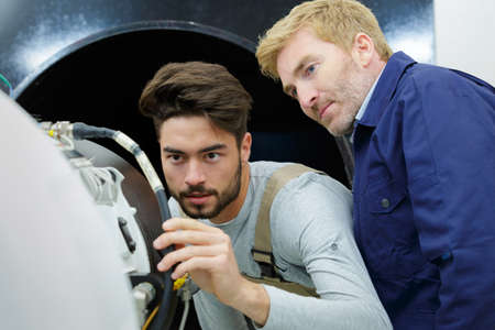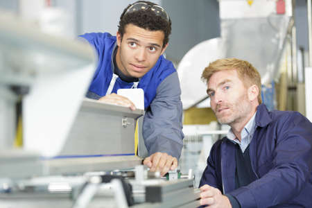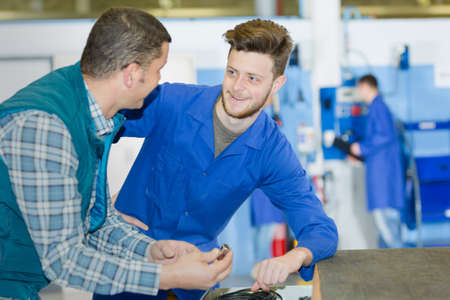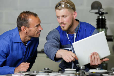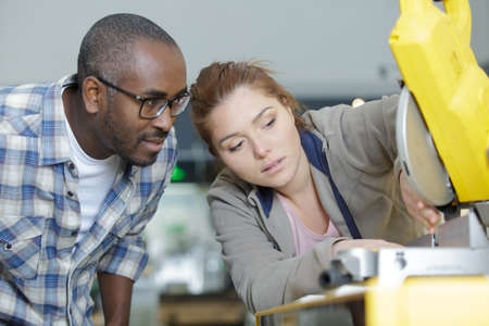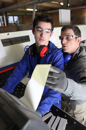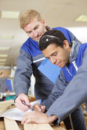 Male apprentice is learning woodworking techniques from older man in a busy workshop