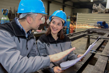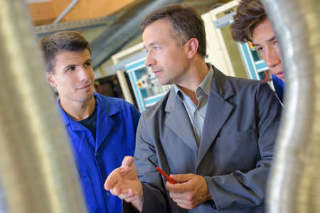 Manager supervisors and industrial worker in uniform doing control in large metal factory hall and talking.
